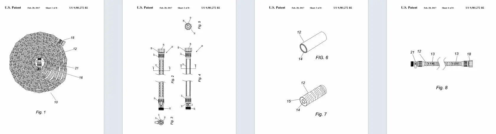 Telebrands Corp旗下拥有200+专利,覆盖家居、厨具、园艺等领域,Pocket Hose系列贡献超30%营收。涉案专利号为US 9,581,272 B2,该专利于2017年2月28日获得美国专利商标局授权,核心保护范围涵盖水管的结构设计、弹性伸缩功能、防扭结技术及便携收纳特性。