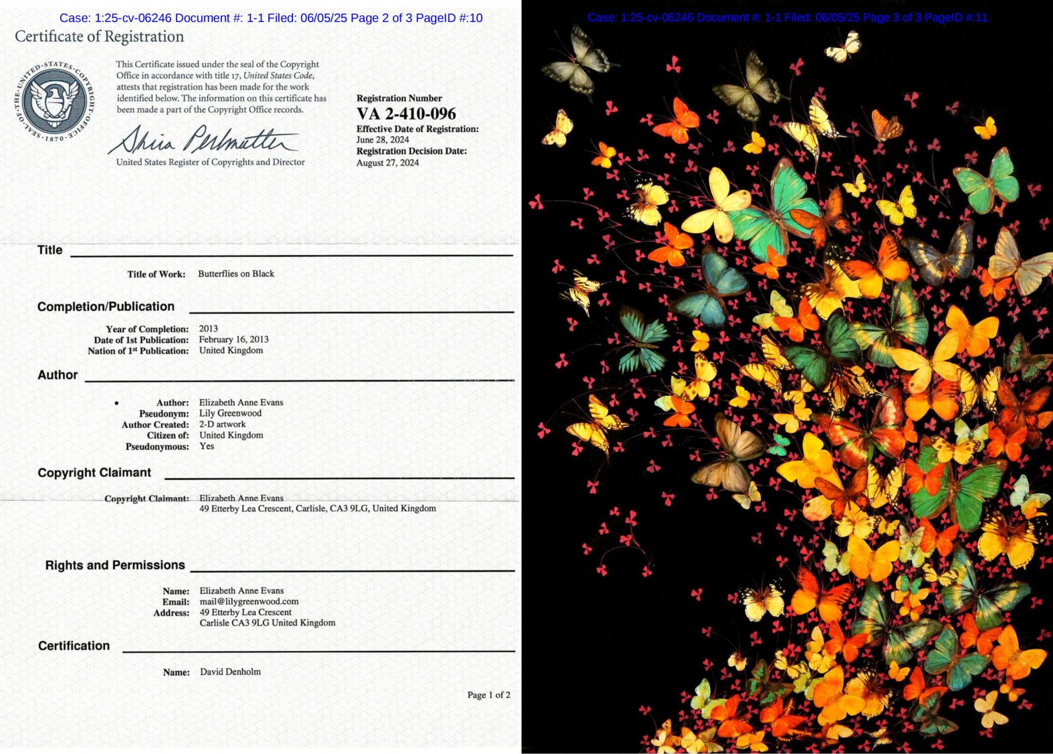版权维权 Lily Greenwood 蝴蝶 VA 2-410-096 2025-cv-06246 Keith律所 Elizabeth Anne Evans tro侵权 TRO冻结 TRO禁令 TRO和解 TRO侵权 美国TRO 跨境电商 亚马逊店冻结 亚马逊运营 Temu 亚马逊 阿里巴巴国际站 速卖通 敦煌网 Wish eBay 沃尔玛 Paypal账户