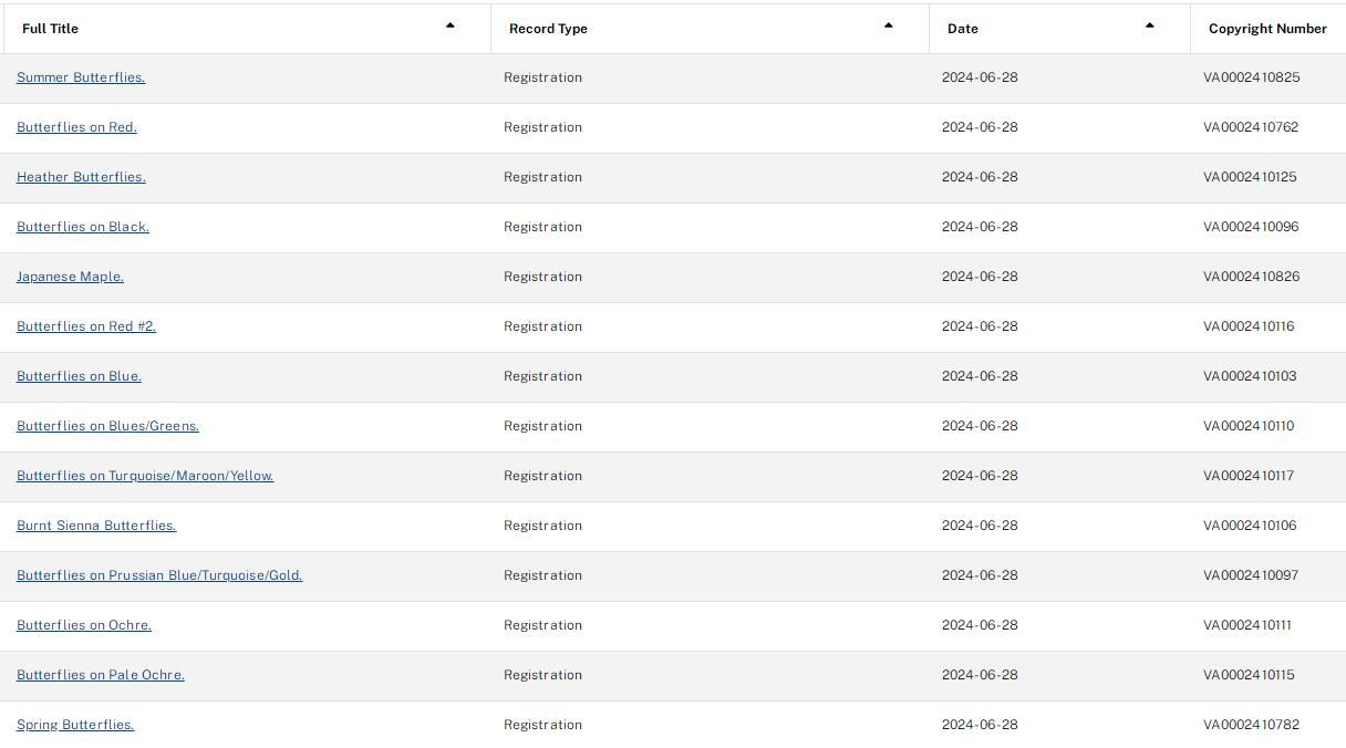 Allen团队通过深度排查确认,Lily Greenwood名下共注册28项蝴蝶相关版权作品,覆盖家居装饰、纺织品、文具、珠宝配饰等多类产品类别。