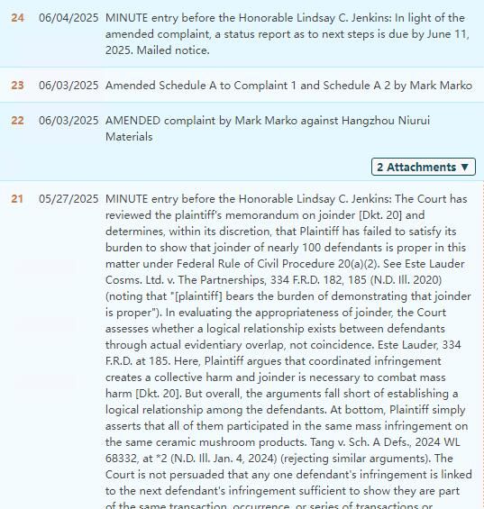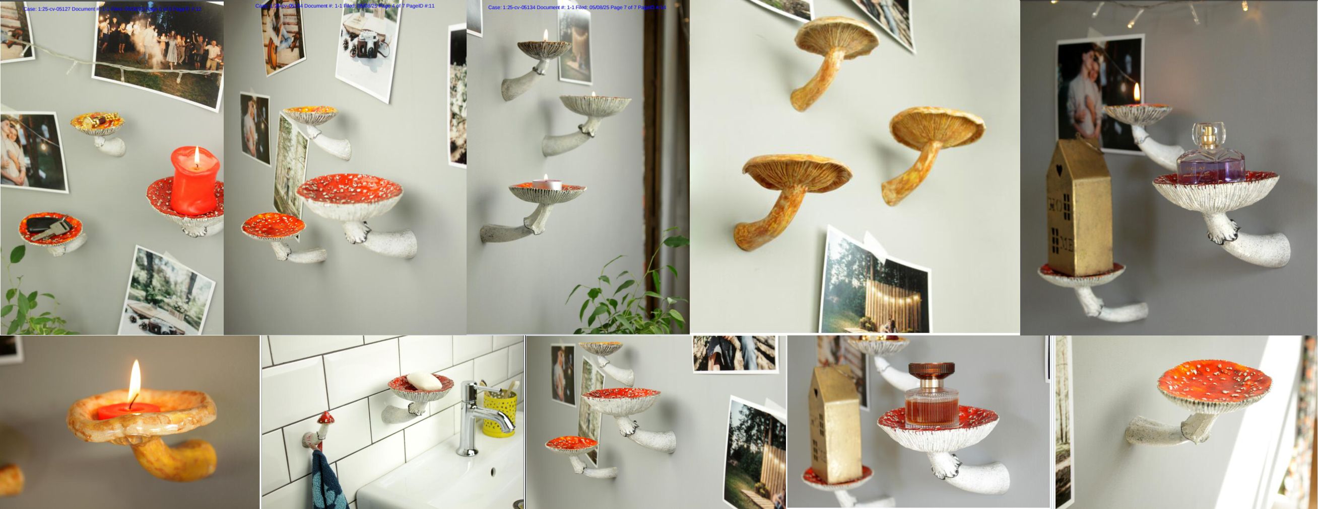 2025年5月8日,美国keith律所代表摄影师兼设计师Mark Marko,针对蘑菇主题置物台及挂钩产品的版权图片,连发5起TRO(临时限制令)维权案件,案件编号分别为2025-cv-05113、2025-cv-05121、2025-cv-05127、2025-cv-05129及2025-cv-05134。此次维权行动共波及109家跨境电商店铺,其中25-cv-05134案件涉案店铺达106家,名单已公开可查。