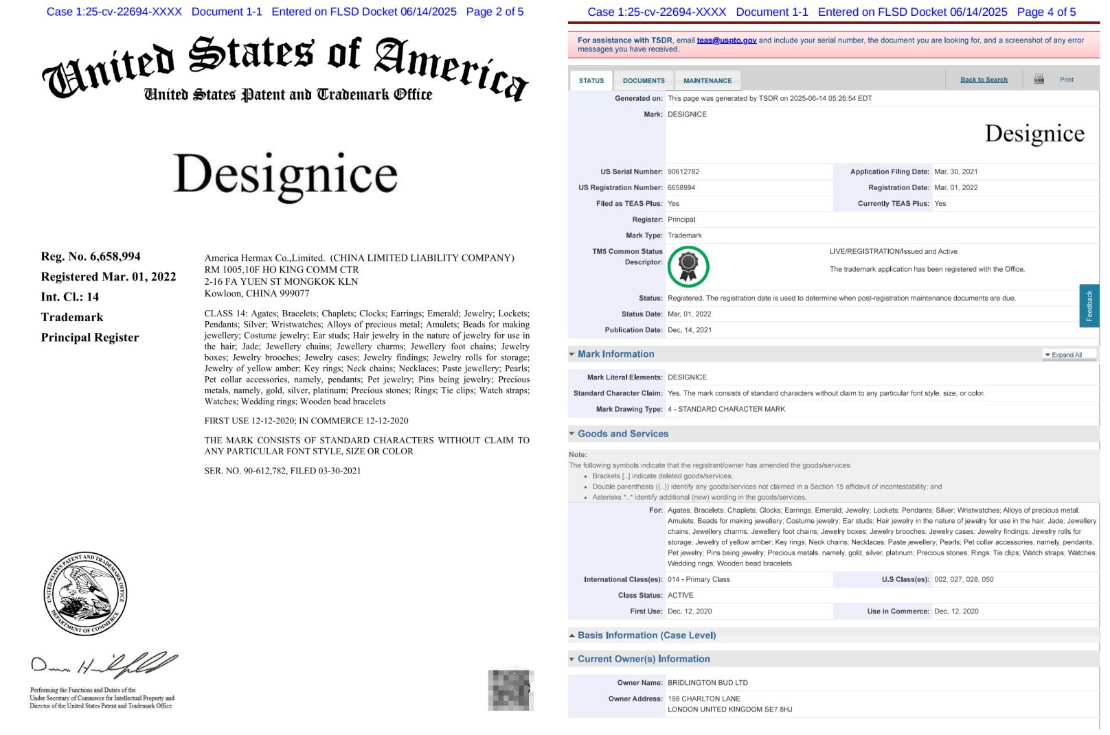 英国综合型企业Bridlington Bud LTD近日通过Palmer律所发起一起针对其旗下珠宝品牌Designice的商标维权案件,案件编号2025-cv-22694。本案于2025年6月14日正式立案,受理法院为佛罗里达州南区地方法院。