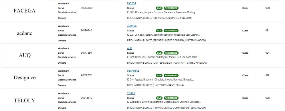 Bridlington Bud LTD 是一家英国综合型企业,业务涵盖商标授权、零售及知识产权维权领域。Designice是Bridlington Bud LTD旗下一个专注于销售一系列珠宝、宝石及相关珠宝配件的珠宝品牌。除此之外,Bridlington Bud LTD还拥有Facega、acdanc、AUQ、Teloly等多个品牌,分别覆盖工具、家具用品、家居装饰、服饰等多个领域。本次维权商标: