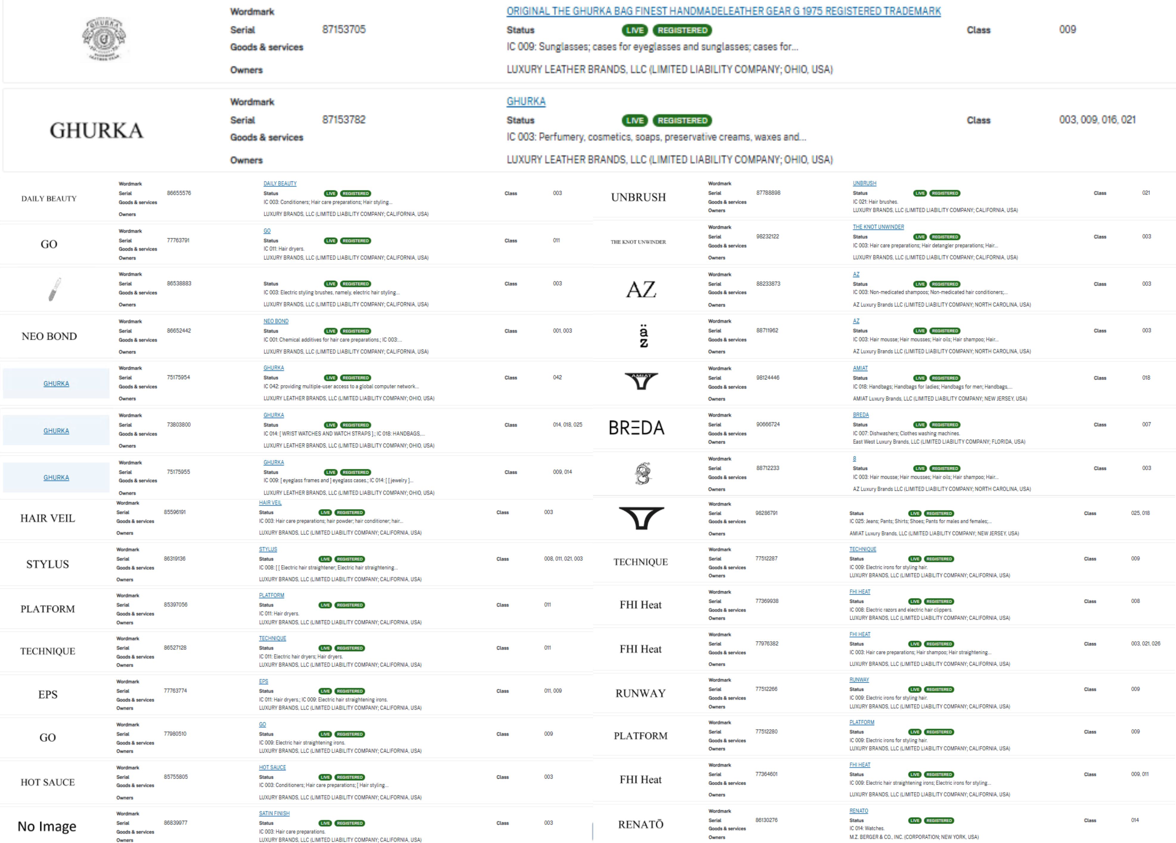 商标矩阵:Luxury Brands, LLC在美国注册超30个商标,包括FHI Heat、UNBRUSH、THE KNOT UNWINDER、AZ、AMIAT、BREDA、RUNWAY等,覆盖沙龙工具、护发产品、美妆配件等领域。