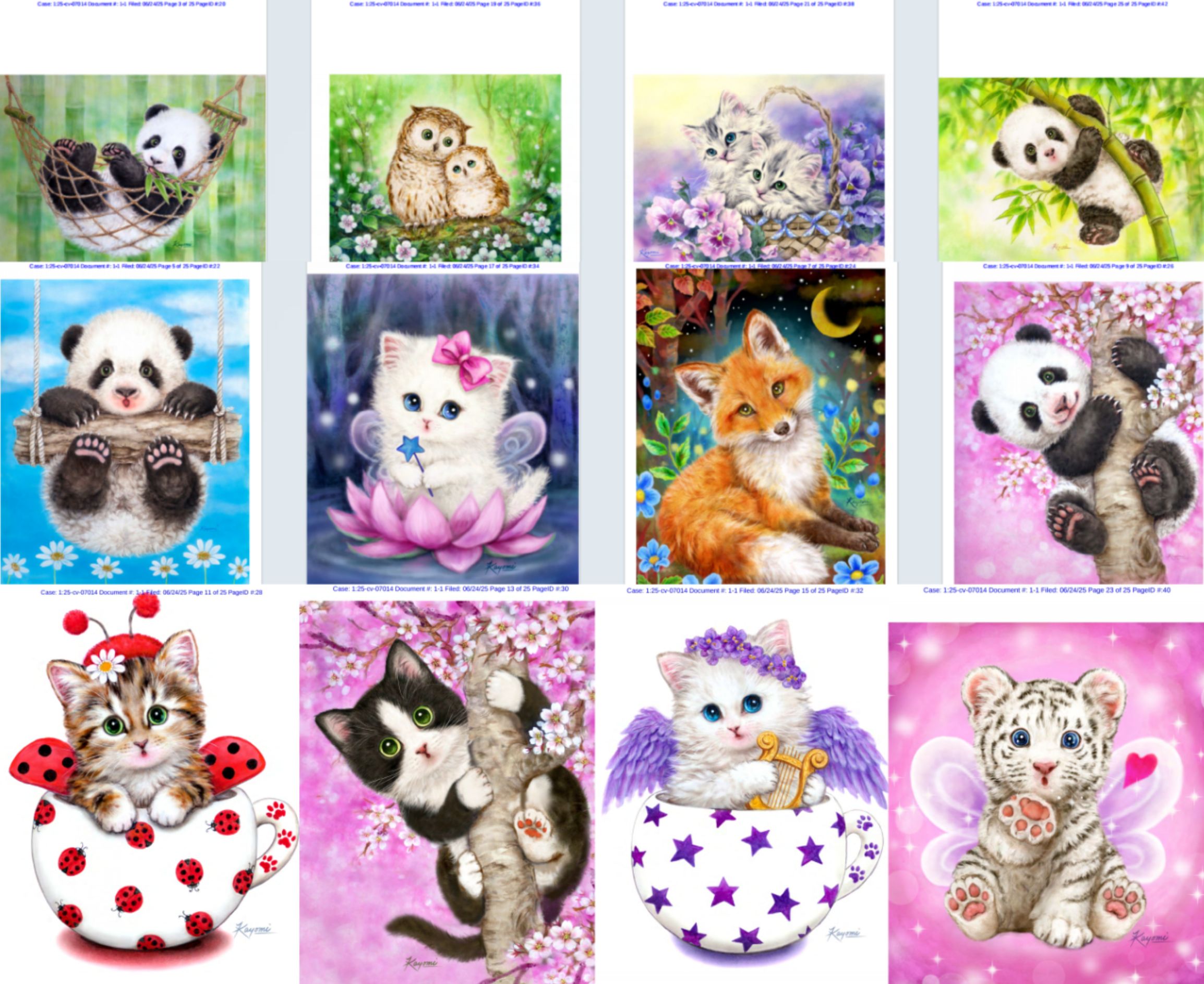 由Keith律所代理的日本艺术家Kayomi Harai,于2025年6月24日向美国伊利诺伊州北区地方法院提起全新版权维权诉讼(案件编号:2025-cv-07014)。这是其继2023年连发四案后,时隔两年再次发起的跨境维权行动。本案涉及12幅以治愈系猫狗为核心的版权作品,应用领域涵盖贺卡、拼图、家居装饰及日历等衍生品类。