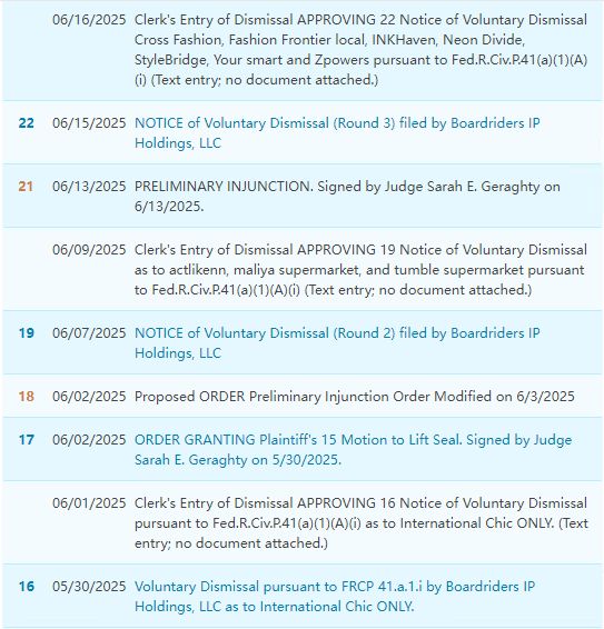 Allen 团队梳理发现,Boardriders 于 2024 年 6 月 12 日以案件号 24-cv-02564 委托 THE SLADKUS LAW GROUP 发起商标维权,涉及 20 个商标,针对滑板爱好者和户外运动爱好者相关的服装、鞋类和配饰等产品,上诉名单高达 400 多名卖家,法庭已批准 TRO 动议且后续批准延长该动议,PI 禁令听证会也已召开;另在 2024 年 8 月 22 日以案件号 25-cv-03738 发起维权案件,虽全网暂未披露太多详细进展,但同样围绕其品牌相关知识产权保护,对未经授权使用旗下品牌商标等侵权行为展开打击 。