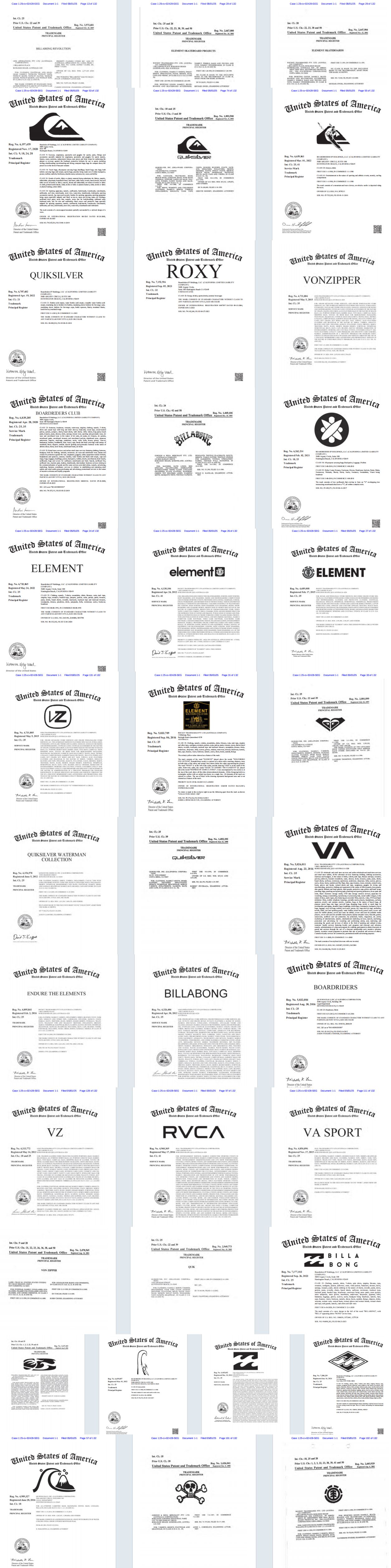 Boardriders IP Holdings, LLC是全球极限运动与时尚领域的领导者,总部位于美国加利福尼亚州。其旗下品牌矩阵覆盖冲浪、滑雪、滑板等核心运动场景。本次维权的 130 余个商标涵盖文字、图形两大类,均注册于第 25 类(服装)、第 9 类(眼镜)、第 28 类(运动器材)等核心类目: