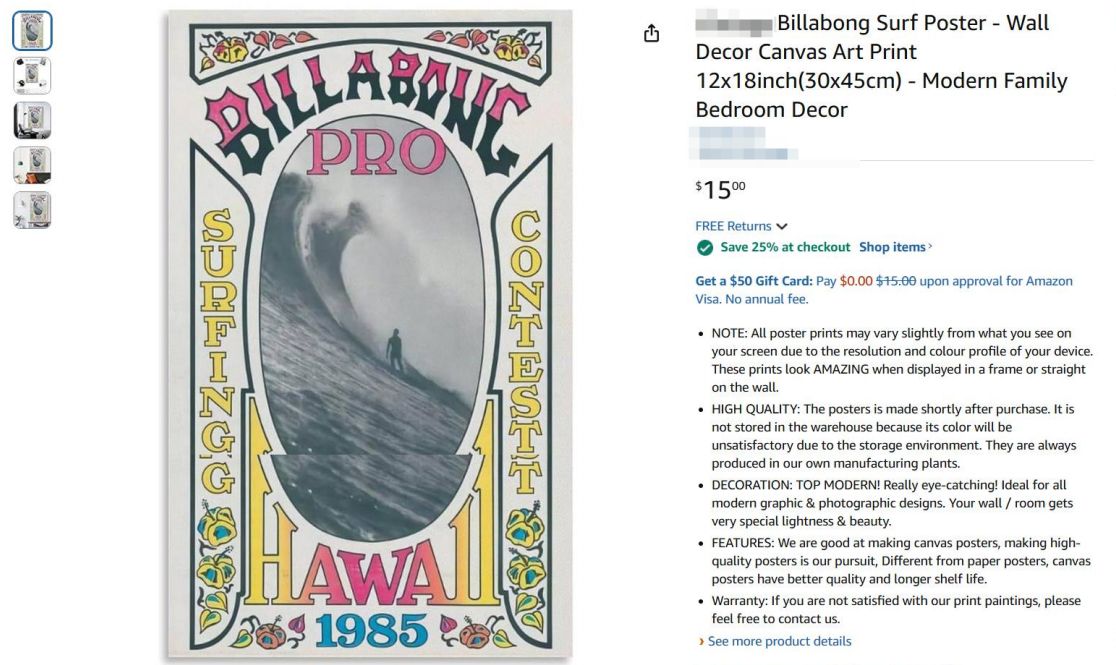 值得注意的是,部分商标通过 “跨类保护” 延伸至非运动领域,比如 “BILLABONG” 在第 32 类(矿泉水)的注册,意味着销售印有该标识的饮用水也可能构成侵权。