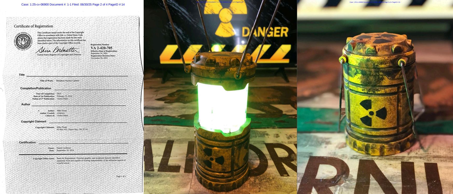 2025 年 6 月,David 律所受美国反乌托邦美学艺术家 Mike Flynn 委托,针对一款跨境热销的复古末日风格灯具发起版权维权,案件编号 2025-cv-06900。据 Allen 团队核实,该作品版权号为 VA 2-420-705,创作于 2024 年 2 月 15 日,同年 9 月 24 日完成版权登记。尤其这款灯具在亚马逊、eBay 等平台长期占据 "复古工业风" 类目热销榜,截至发稿仍有近 50 家店铺在售同款产品,相关卖家需立即下架排查。