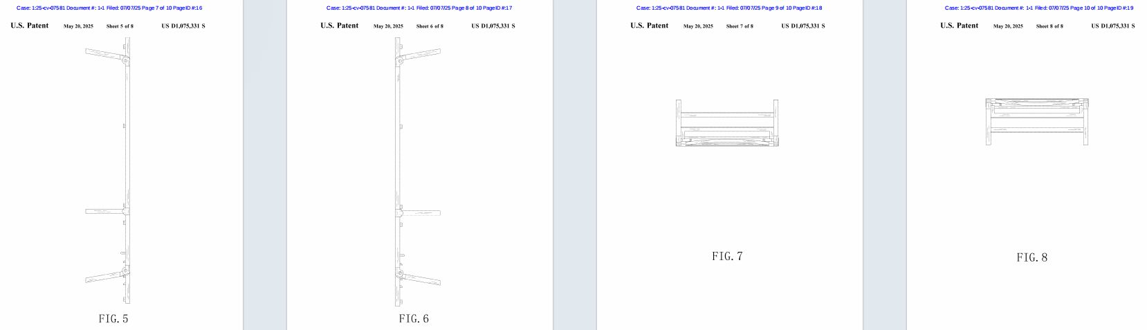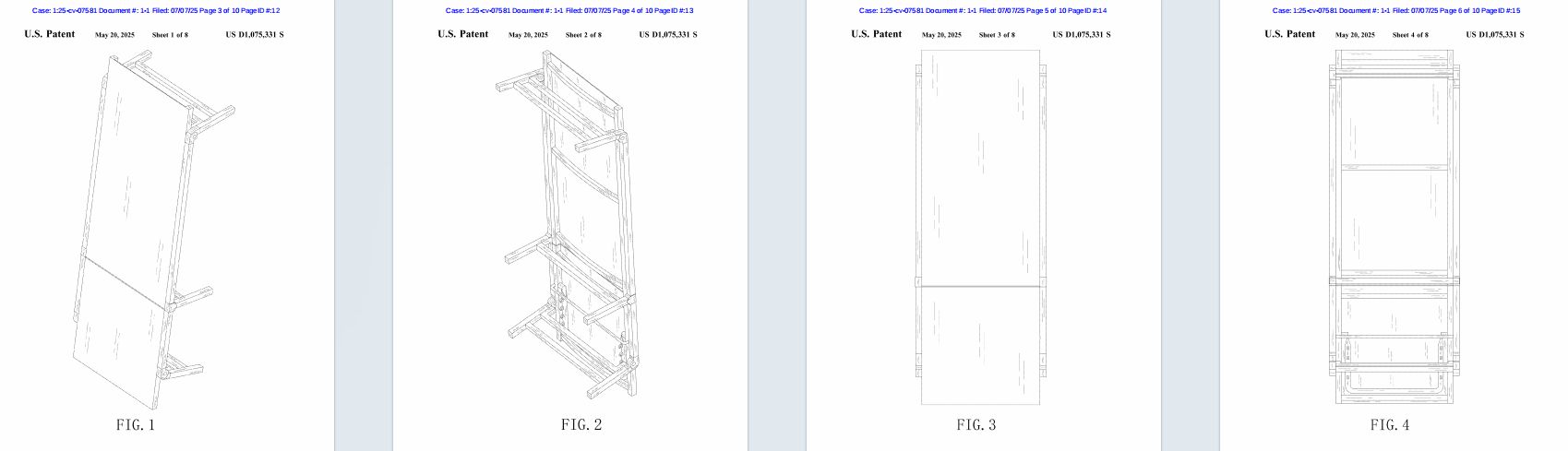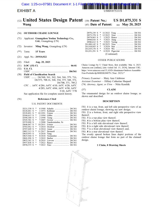 本案系 Dewitty Law Offices 于 2025 年 6 月 15 日代理广州优澜科技有限公司(Guangzhou Youlan Technology Co. Ltd.)发起的跨境知识产权维权诉讼,案件编号 25-cv-07581。Allen 团队通过法律数据库核查发现,涉案专利为编号 D1075331 的 “Outdoor chaise lounge” 户外躺椅外观设计专利,该专利于 2023 年 8 月 25 日提交申请,2025 年 5 月 20 日正式获得美国专利商标局(USPTO)认证。