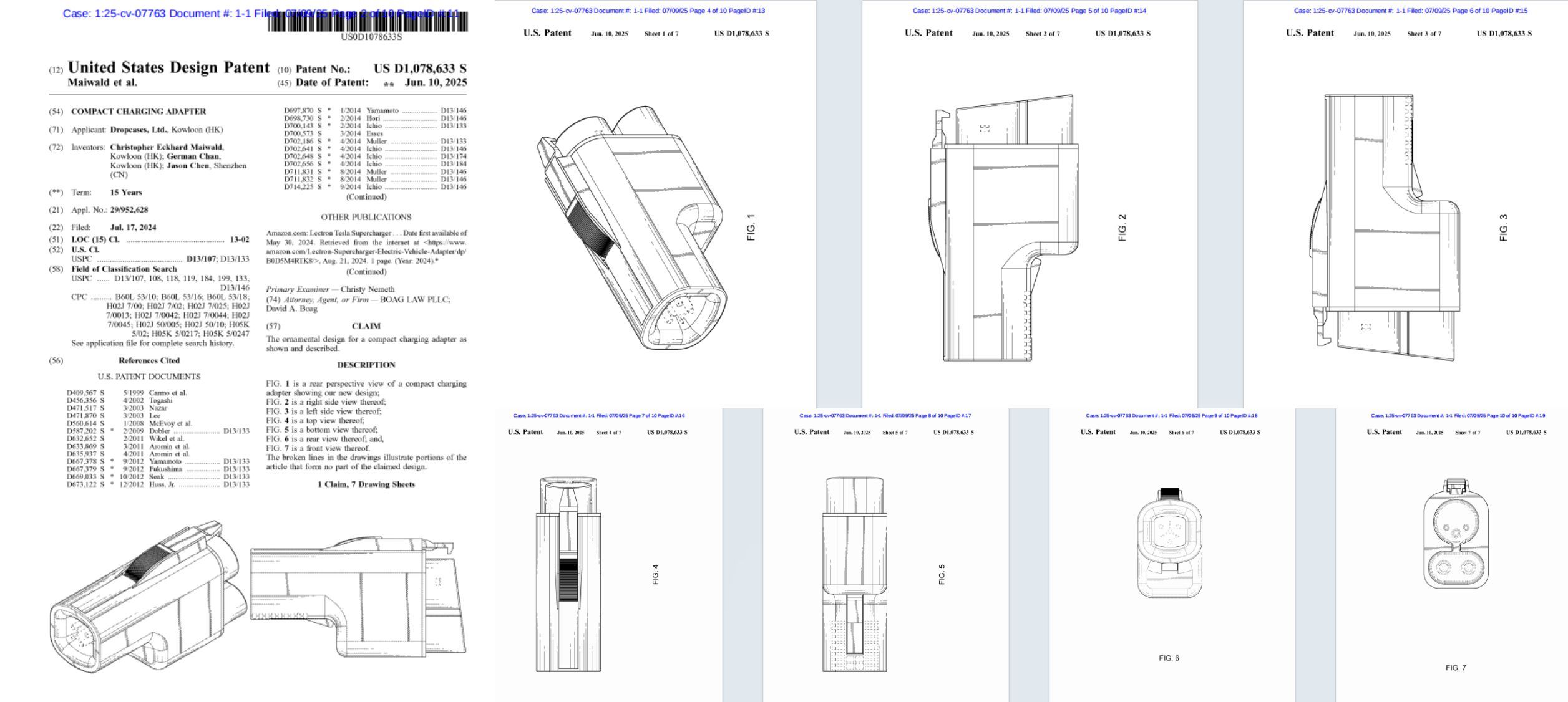 本案系 Wiggin and Dana LLP 律所于 2025 年 7 月 9 日代理香港科技企业 Dropcases, Ltd. 发起的跨境知识产权诉讼,案件编号:2025-cv-07763,由美国伊利诺伊州北区联邦地方法院受理。Allen 团队通过法律数据库核查发现,本案为 Dropcases 近三年来第 5 次针对电车充电设备发起的跨境维权,涉案产品为专利号D1078633的电车充电适配器,该专利于2025年6月10日正式下证,保护其独特的外观结构设计。此外,Dropcases名下注册的Lectron商标(第07类-机械设备)涵盖电动汽车充电设备,包括充电站及适配器。