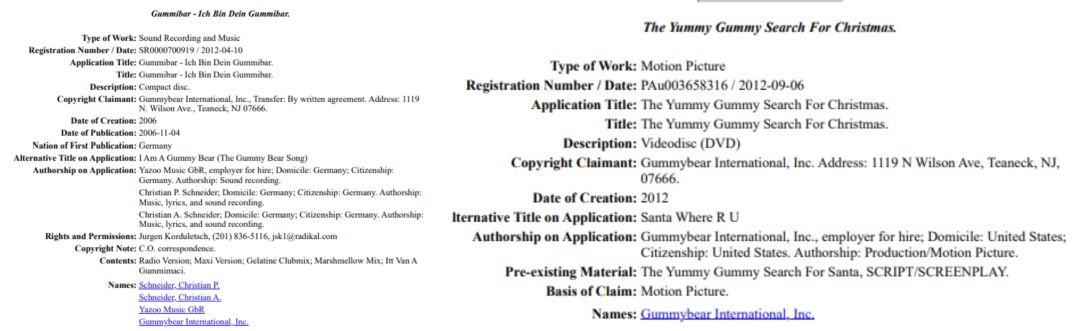 版权:原告主张对《Gummibär: I Am A Gummy Bear》音乐视频(2007 年创作)及衍生动画短片享有著作权,涵盖角色设计、配乐旋律及动态视觉效果。未经授权的二次创作、数字化传播或实体衍生品开发均构成侵权。