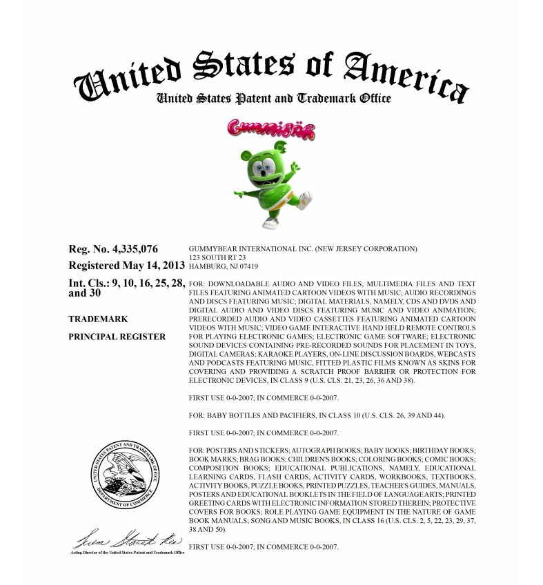 商标权:美国商标 4335076 覆盖玩具、电子游戏、服装配饰、文具等 25 类商品,其核心识别元素为三维立体软糖熊形象(Gummibär)及配套文字标识 "Gummy Bear"。