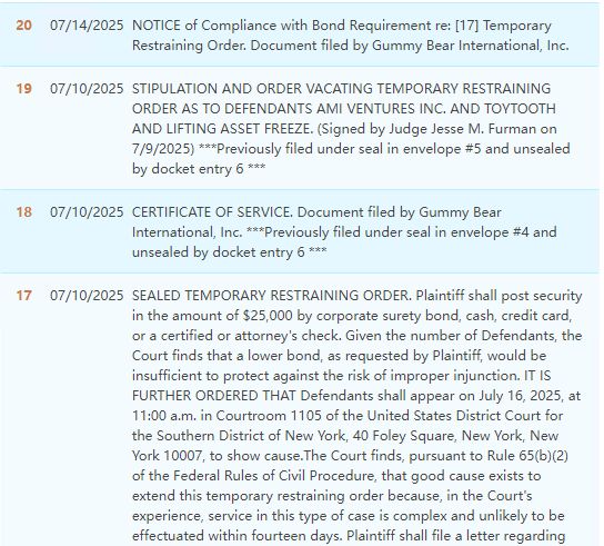 25-cv-04832 Gummy Bear 果冻熊 Gummy Bear International TRO临时限制令 Kagen Caspersen & Bogart tro侵权 TRO冻结 TRO禁令 TRO和解 TRO侵权 美国TRO 跨境电商 亚马逊店冻结 亚马逊运营 Temu 亚马逊 阿里巴巴国际站 速卖通 敦煌网 Wish eBay 沃尔玛 Paypal账户