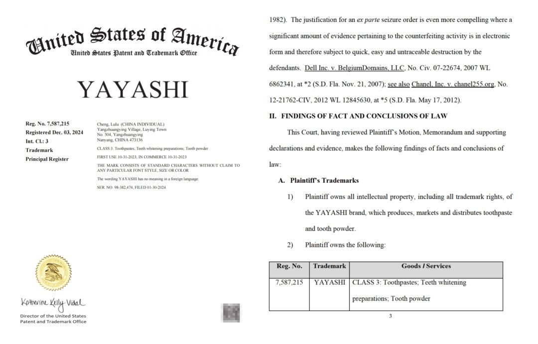 本案为AU LLC律所代理的国人卖家Lulu Cheng在佐治亚州北区地方法院亚特兰大分庭发起的商标维权案件(案件编号:2025-cv-03300)。涉案产品为YAYASHI益生菌美白牙膏,该产品于2024年12月3日获得美国商标认证,核心功效为通过物理摩擦与化学分解双重作用温和去除茶渍、烟渍等外源性色斑,同时添加乳酸杆菌平衡口腔菌群,改善蛀牙及牙龈问题。案件已于2025年7月8日获批临时限制令(TRO),涉案31家店铺账户资金被冻结。法院文书显示,TRO 生效时间为 7 月 8 日至 7 月 29 日(14 天临时限制期),期间禁止被告销售侵权产品、转移账户资金或销毁相关证据。
