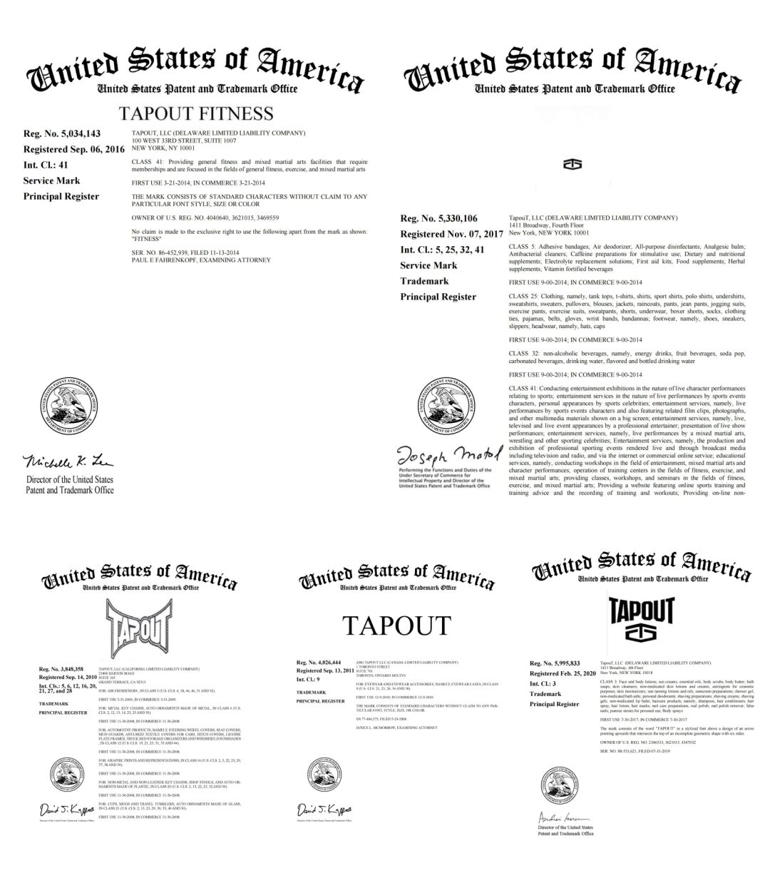 文字商标5000000:覆盖 T 恤、短裤、运动外套等25类服装,核心识别元素为全部大写字母 "TapouT" 及配套的红白火焰纹边框设计。