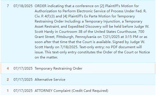 案件于 7 月 17 日在宾夕法尼亚州联邦法院立案,目前处于TRO 临时限制令申请关键期,预计 7 月 31 日前原告将正式递交申请文件,8 月中旬安排听证会。