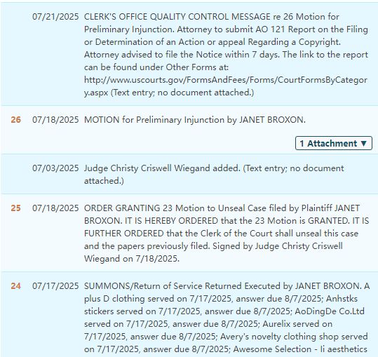 插画 版权维权 TRO 25-cv-00924 Janet Broxon插画 Ference律所 临时禁令 Janet Broxon Ference & Associates tro侵权 TRO冻结 TRO禁令 TRO和解 TRO侵权 美国TRO 跨境电商 亚马逊店冻结 亚马逊运营 Temu 亚马逊 阿里巴巴国际站 速卖通 敦煌网 Wish eBay 沃尔玛 Paypal账户