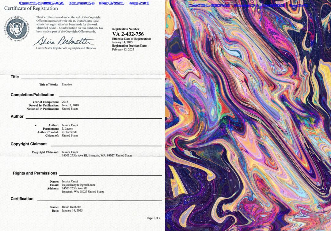 本案是Ference律所在 2025 年 6 月 30 日代理美国当代艺术家Jessica Crupi发起的版权维权案件,案件编号 2025-cv-00902。原告针对其 2018 年 6 月创作的超现实风格图案(美国版权号:VA 2-432-756,2025 年 1 月 14 日完成登记)展开跨境维权。该图案因独特的视觉张力被广泛用于服饰花纹,目前已有 60 家跨境店铺被固定侵权证据,案件处于TRO临时限制令申请关键阶段。