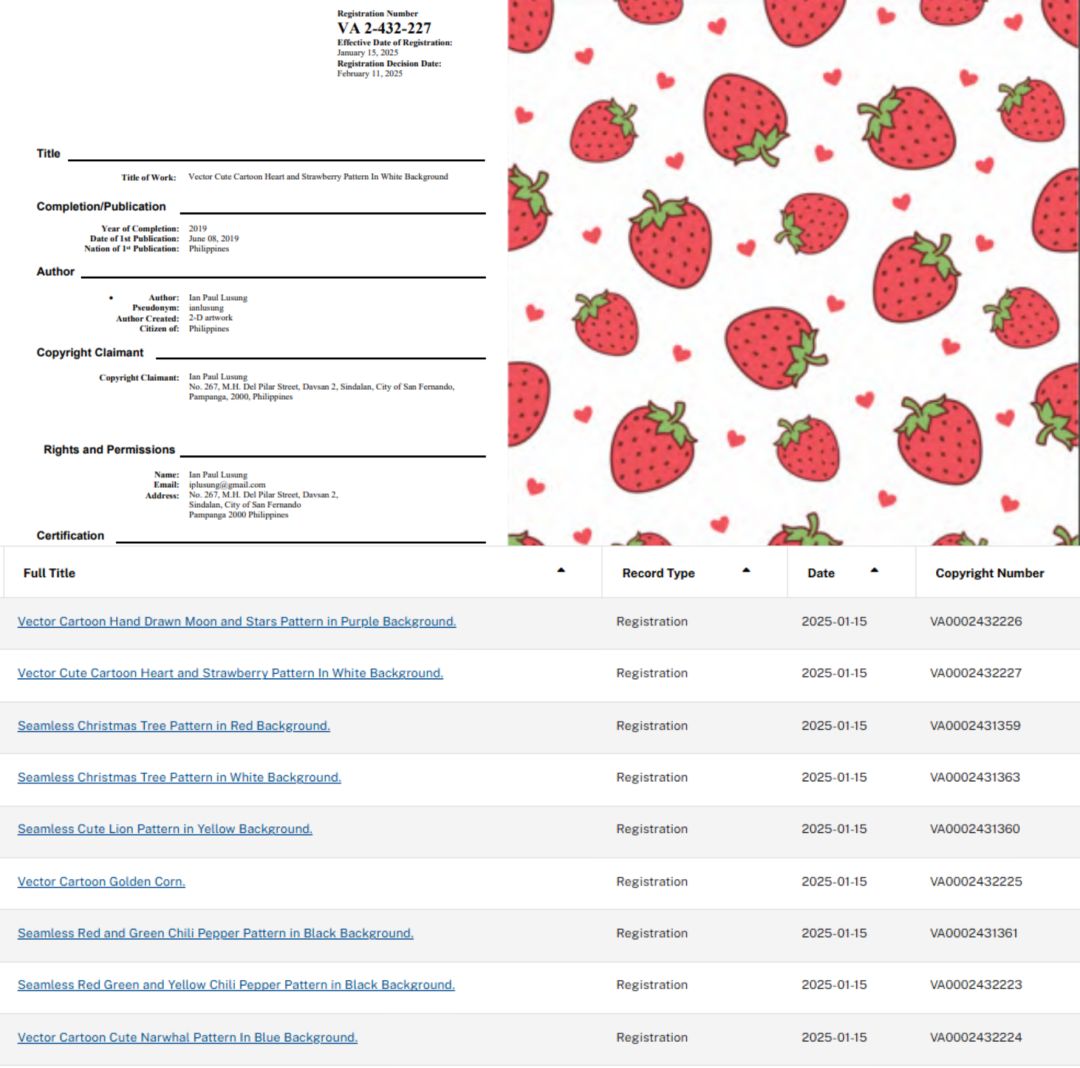 2025年7月16日,美国Ference律所在宾夕法尼亚州西区联邦法院提起一起版权维权案件(案件编号:2025-cv-00989),代理菲律宾艺术家Ian Lusung对其注册的9个版权图案进行维权。涉案作品于2025年1月15日获得美国版权局认证(版权号:VA 2-432-227),目前法院已批准临时限制令(TRO),并冻结200余家跨境店铺资金。值得注意的是,本案TRO有效期为14天(可申请延长一次至28天),原告或将在近期申请初步禁令(PIO)以持续冻结资产。需获取冻结店铺名单或组团应对的卖家,可联系Allen团队获取专业支持。