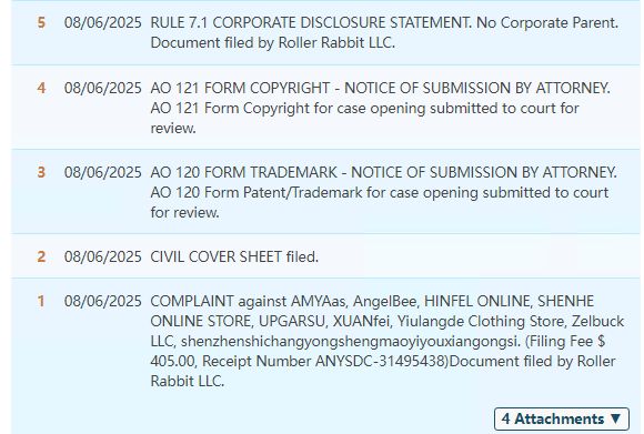 25-cv-06484 Roller Rabbit Sriplaw律所 Roberta Freymann 猴子图形商标 tro侵权 TRO冻结 TRO禁令 TRO和解 TRO侵权 美国TRO 跨境电商 亚马逊店冻结 亚马逊运营 Temu 亚马逊 阿里巴巴国际站 速卖通 敦煌网 Wish eBay 沃尔玛 Paypal账户