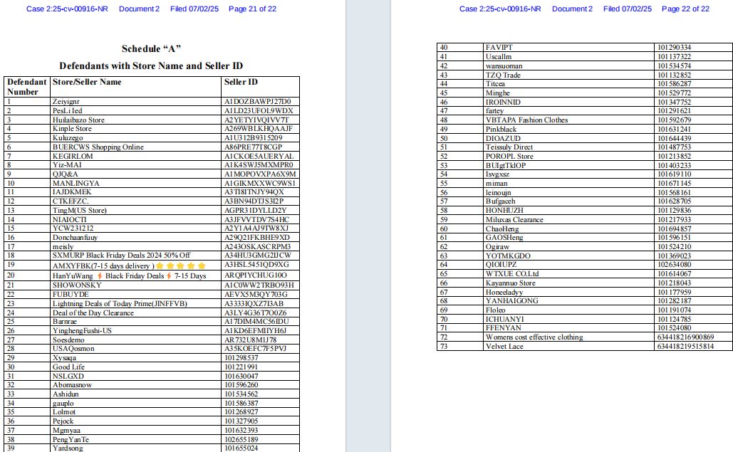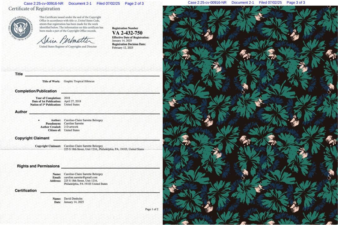 本案由Ference律所代表平面艺术家Caroline-Claire Sarrette Belorgey发起,涉及其2025年1月14日获美国版权局认证的作品《Graphic Tropical Hibiscus Work》。案件编号为2025-cv-00916,原告以版权侵权为由,向宾夕法尼亚州联邦法院申请临时禁令(TRO)。截至7月24日,法院已对73家涉案店铺完成证据保全,TRO预计将于近期获批,账户冻结程序可能随时启动。卖家需在15日内完成自查,否则可能面临资金冻结及高额赔偿。