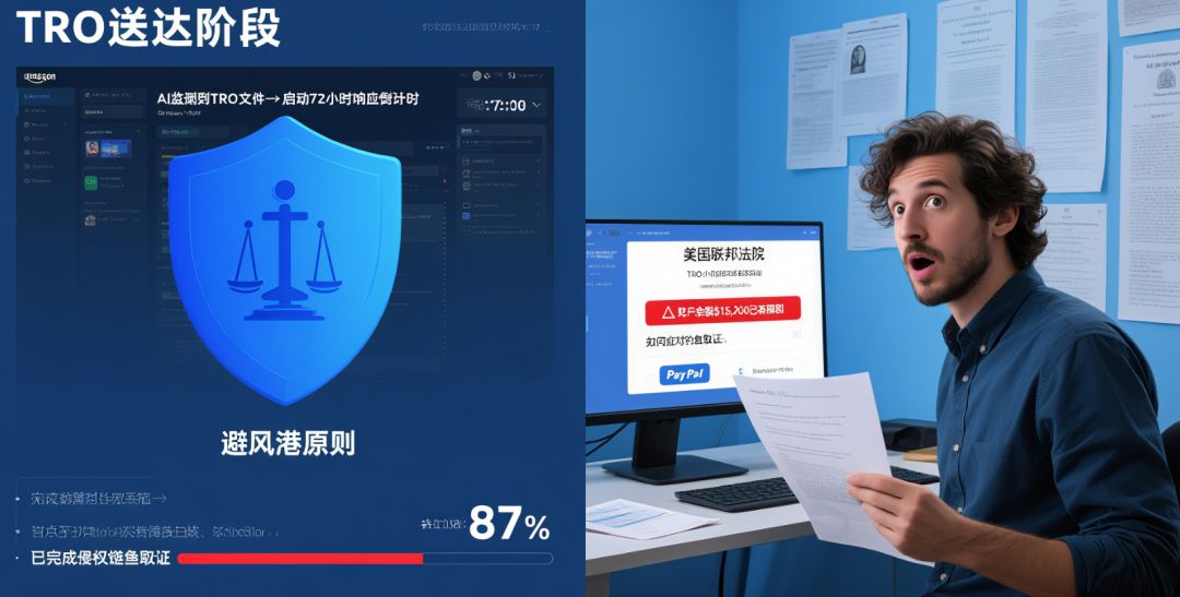 取证与冻结的闪电战:平台卖家的侵权证据收集高度依赖AI技术。GBC律所的 "DeepScan" 系统可在0.3秒内完成商品图片的三维建模比对,并关联历史销售数据生成侵权概率模型。这种技术优势使得平台卖家往往在TRO签发后24小时内即遭资金冻结,且无法通过下架商品止损 —— 亚马逊等平台会持续性冻结后续销售所得。