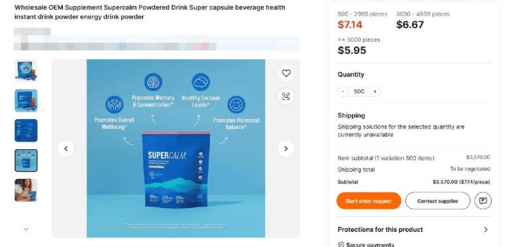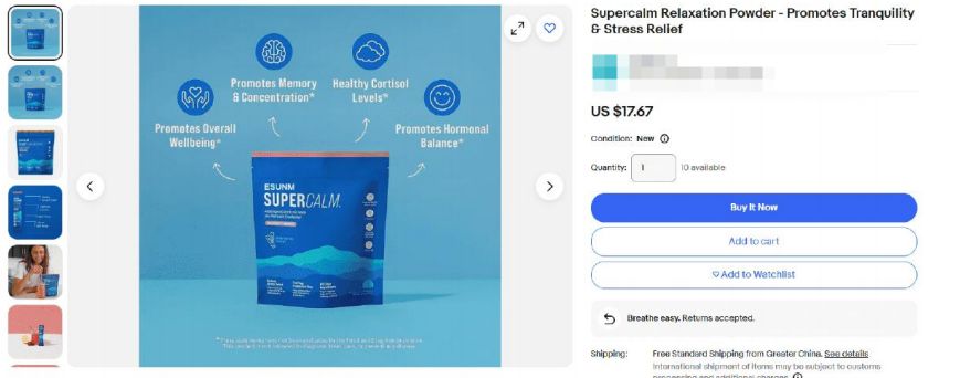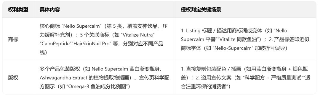 自查重点:立即检查店铺内保健类产品(如褪黑素、胶原蛋白)是否使用“Nello Supercalm”或“SUPERCALM”商标,重点核查标题、描述及包装标签。对比产品包装设计是否与品牌方公开的保健饮品图案高度相似(如极简风格、自然元素主题)。