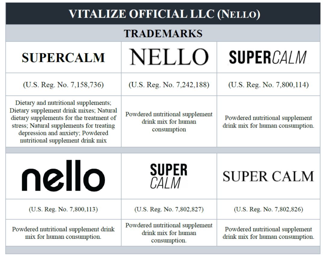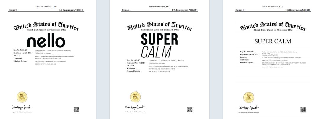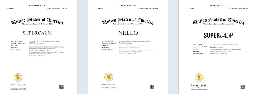 VitalizeOfficialLLC在美国注册了6项核心商标,包括NelloSupercalm品牌标识及保健饮品相关图形版权,覆盖商品分类第5类(膳食补充剂)、第32类(饮料混合物)。其商标设计包含独特的蓝绿色漩涡图案与「SCIENCE-BACKEDNUTRITION」宣传语,形成强识别性。值得注意的是,品牌方同时主张包装设计专利,禁止未经授权使用类似瓶身曲线或标签布局。Allen团队结合USPTO公开数据及法院文件,梳理关键维权要素:
