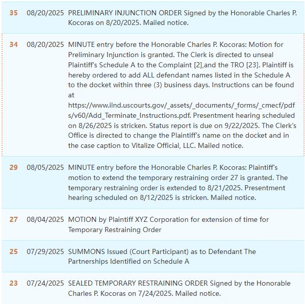 Sullivan律所于2025年7月上旬代理美国保健企业VitalizeOfficialLLC,发起匿名商标维权诉讼(案件编号:2025-cv-07899)。案件初期因“避免卖家提前下架规避取证”未披露品牌信息,目前已进入关键阶段:TRO临时限制令已生效,238家涉案店铺账户资金被成功冻结,覆盖亚马逊、沃尔玛、iHerb等主流保健品类平台;同时原告已向法院提交PI初步禁令申请,若获批将延长冻结期限并扩大追责范围。Allen团队通过法院文件核查确认,VitalizeOfficialLLC在美国布局6个核心商标及多个版权图案,均聚焦保健饮品、膳食补充剂类目,已收到TRO传票的卖家需在21天内紧急处理,未收到传票但售同类产品的卖家,可联系Allen团队获取涉案名单自查。