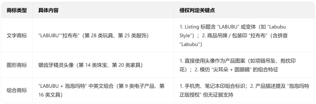 商标保护细节:包括文字商标"LABUBU"的大小写变体、艺术字体设计,以及与九齿精灵形象组合的图文商标,哪怕只使用"拉布布"中文译名也可能构成侵权。