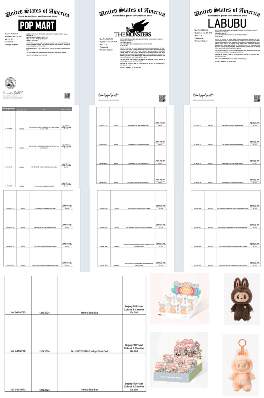 LABUBU主商标:三个商标号(6592820、7839156、7839144)均注册在第28类,覆盖"玩具、人偶、盲盒、游戏机"等核心商品,其中最早的6592820商标早在2016年就已完成国际注册,体现品牌对知识产权保护的前瞻性;