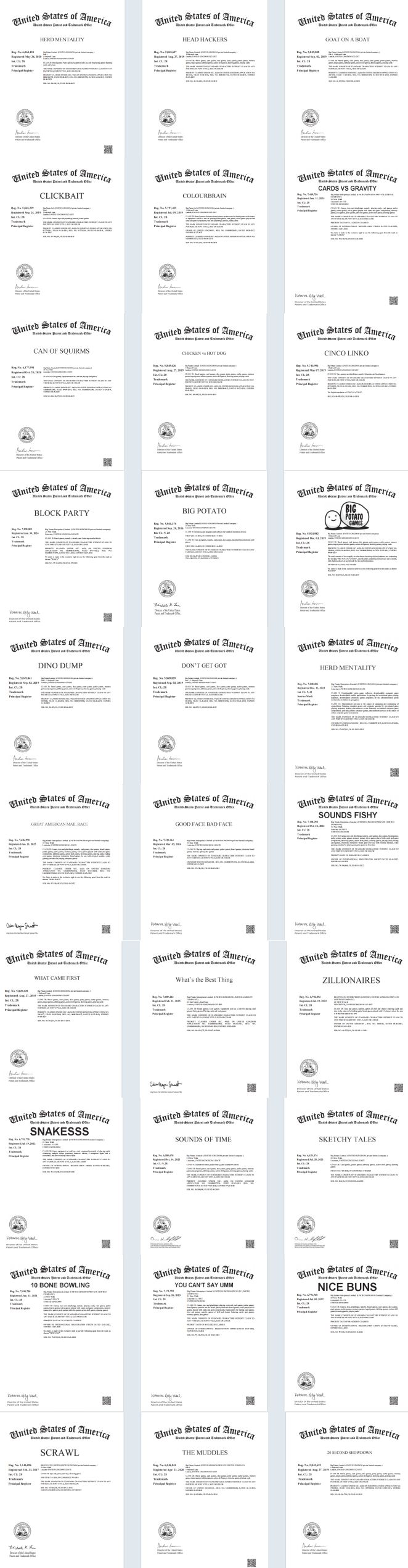 主品牌商标:"BIGPOTATO"(注册号推测860XXXX)作为核心商标,覆盖所有品类的桌游产品,尤其在包装、说明书、商品标题中出现即构成侵权;