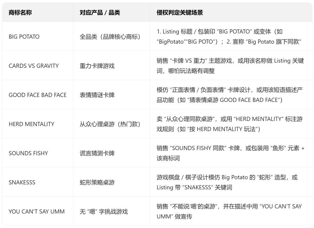 Allen团队还注意到,这次维权涉及的商标不是一两个,而是BigPotato的核心品牌词和热门游戏名,比如“BIGPOTATO”“THECHAMELEON”(变色龙)、“HERDMENTALITY”(从众心理)这些,只要Listing里沾了边,或者卖的游戏玩法、包装跟正品相似,都可能被盯上。如果已经收到TRO传票、账户被限制,别慌,联系我们能帮你对接和解方案;还没涉案的卖家,赶紧按下面的方法排查,别等下一轮维权找上门。