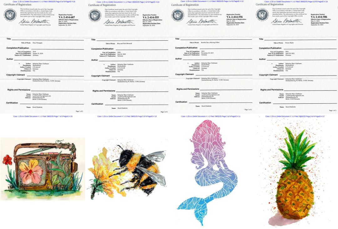 做文创、服饰家居类目的卖家得留意了,柏林艺术家SebastianMarcGrafmann的版权维权案已经立案,虽然还没冻店,但风险已经很近了!Keith律所在近期代理Sebastian,于联邦法院发起版权维权诉讼(案件编号:2025-cv-10464),核心针对他在2024年5月21日获美国版权局认证的4个作品(VA2-414-555、VA2-414-556、VA2-414-586、VA2-414-687)。