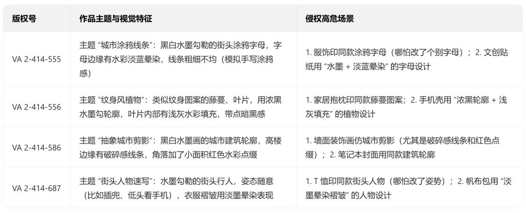 虽然美国版权局官网尚未公开高清图样,但结合艺术家风格和商业授权记录,Allen团队还原出4项版权的核心特征,卖家可按此排查:
