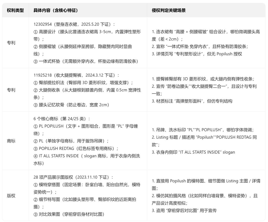2025年8月中旬,美国互联网时尚品牌Popilush这波维权,直接把“专利+商标+版权”全用上了!MayerBrownLLP律所在近期代理PopilushLLC,发起全方位知识产权维权诉讼(案件编号:2025-cv-10581)。作为跨境服饰圈的“维权常客”,Popilush这次没留漏洞:手握2个核心塑形服饰专利、6个品牌商标,还有28项产品展示图版权,从产品设计到宣传素材全保护,现在案件已经进入取证收尾阶段,Allen团队从MayerBrown过往服饰类维权案例判断(比如2024年某塑身衣品牌案,取证后12天申请TRO),预计1-2周内就会向法院提交TRO临时限制令申请,未及时排查的卖家很可能面临账户冻结。