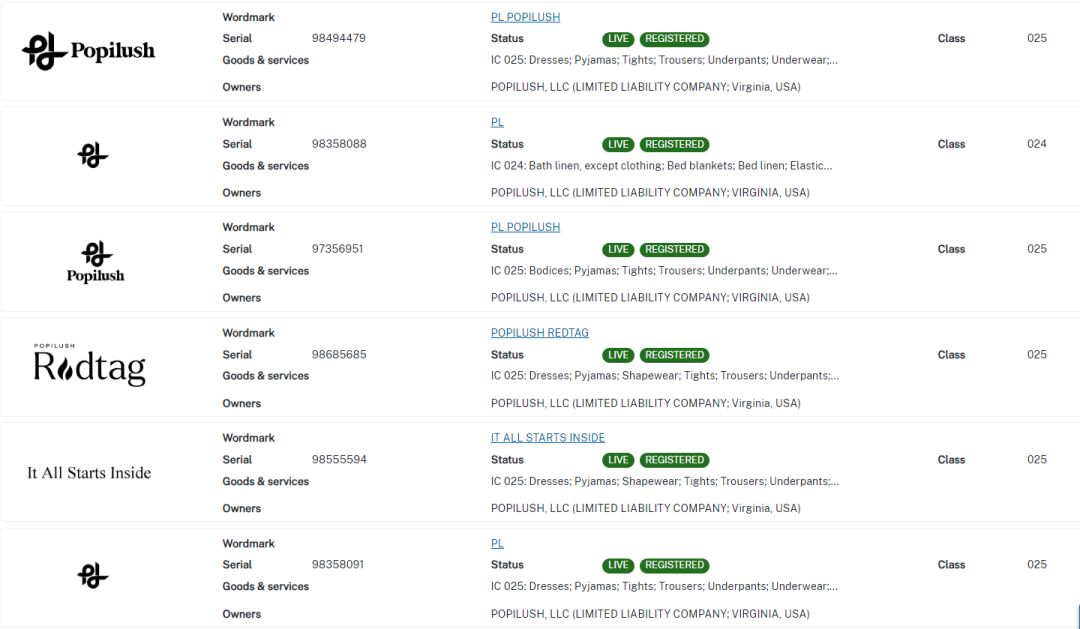 系列商标:"PLPOPILUSH"(第24类)用于面料产品,"POPILUSHREDTAG"(第25类)针对促销商品,"ITALLSTARTSINSIDE"(第25类)作为宣传标语禁止在广告语中使用。