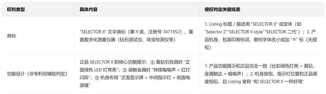 自查重点:打开所有珠宝检测设备的Listing,删除“SELECTORII”及所有变体——包括“Selector2”“SELECTOR二代”“SELECTORII同款”“和SELECTORII一样准”,哪怕是“参考SELECTORII设计”这种擦边描述也得删。特别提醒有的卖家会用“钻石测试仪绿色灯提示”,虽然没提商标,但如果产品功能和正品一致,也可能被律所关联认定为“刻意蹭流量”,建议改成“钻石测试仪多色灯提示”,模糊化表述。