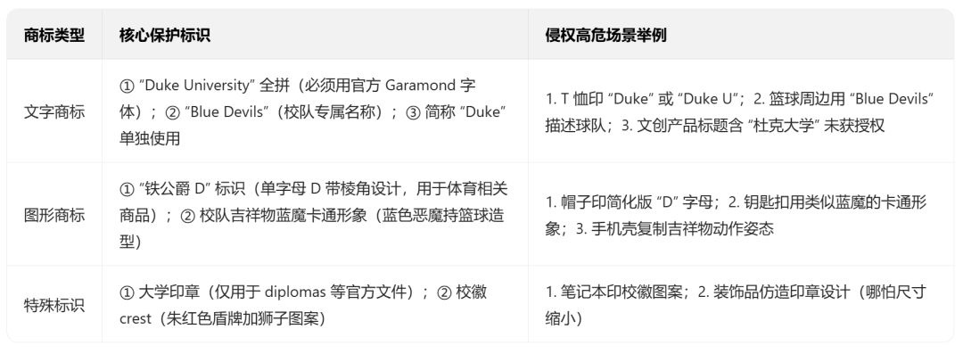 文字商标家族:不仅包括"DukeUniversity"全称,还涵盖"Duke"缩写、"BlueDevils"球队名等衍生标识。特别需要注意的是,法院在类似案件中认定"DUKE"大写字母组合(字体倾斜15°)具有独立显著性,单独使用即可能构成侵权。