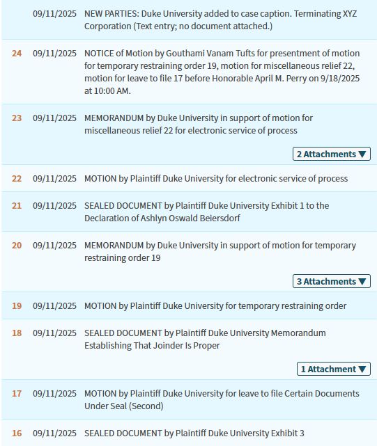 9月3日Sullivan律所代表杜克大学提交诉状,试图以匿名方式发起诉讼,但法院在9月10日驳回该请求,理由是“公立大学的知识产权诉讼应遵循公开司法程序”;当前处于被告名单调整期,原告需在10月1日前将81名被告缩减至40人,并提交“各被告侵权行为关联性说明”,从行业经验看,这种调整往往是申请TRO的前奏。