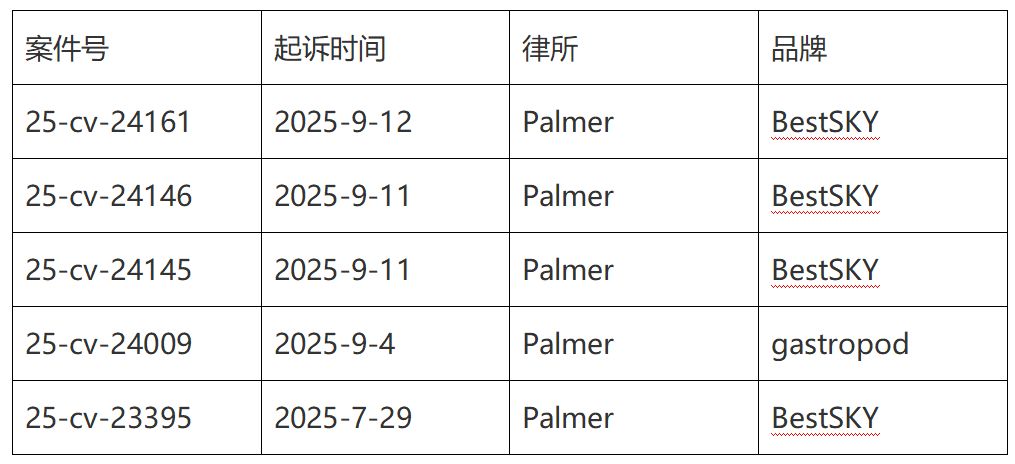2025年9月5日由Palmer律所向德克萨斯州东区地方法院提交诉状,目前处于证据开示阶段;法院已要求原告在10月10日前完成侵权证据公证(包括商品对比图、销售数据链),按Palmer律所过往案件节奏,TRO申请大概率在10月中旬提交,账户冻结可能在48小时内执行。