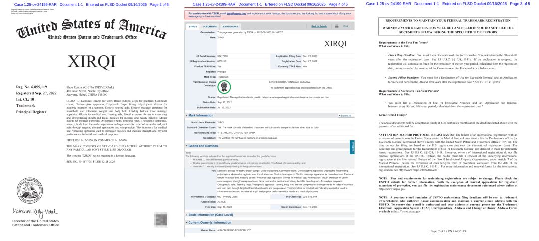 Palmer律所代理英国品牌Albion Brand Foundry LTD发起的2025-cv-24199案件已正式进入诉讼程序!本次维权聚焦其核心商标XIRQI(商标号6855119),覆盖第10类医用体温计、医用鼻贴、医用冰袋、输氧管、猫用兽药注射器等23项医疗设备及耗材。Allen团队从法院系统获悉,该案首批已锁定超200家亚马逊、eBay店铺,预计9月底前将提交TRO(临时限制令)申请,冻结涉案账户资金。