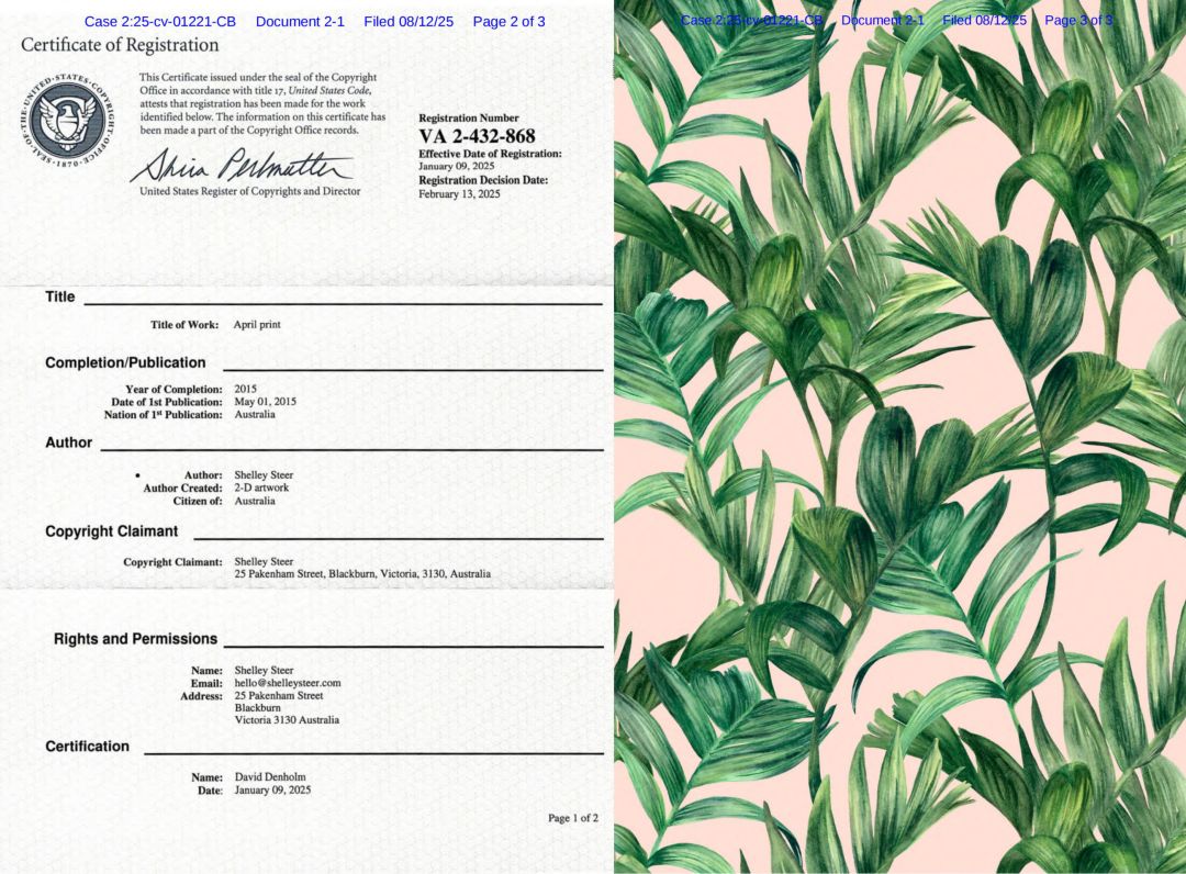 澳洲知名植物插画师Shelley Steer的版权维权已经有了实质性进展!Keith律所联合Ference&Associates LLC,在宾夕法尼亚州联邦法院发起的侵权诉讼(案件编号:2025-cv-01221),不仅成功获批TRO临时限制令,冻结了41家涉案店铺。这次维权的核心是Shelley Steer的绿色棕榈树叶版权(VA2-432-868),这幅2024年完成、2025年获美国版权认证的作品,因为精细的叶脉纹理和浓郁的水彩质感,早就被授权给Anthropologie的壁纸、Petite Friture的抱枕等知名品牌。