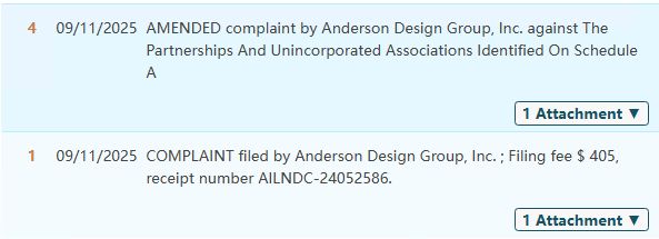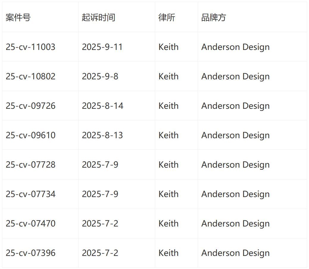 美国复古设计巨头Anderson Design Group(ADG)的维权风暴正在升级!Keith律所在9月集中发起三轮诉讼,案件编号2025-cv-11011、2025-cv-11012(9月12日立案)与25-cv-11003(9月11日立案)接连轰炸,加上月初的25-cv-10802案件,短短两周内被告总数已达377家。Allen团队从伊利诺伊州法院最新文件获悉,本次维权不仅延续了对经典旅行海报的保护,还新增9款2025年新作,预计最终涉案店铺将突破千家,TRO冻结申请最快本周内提交。