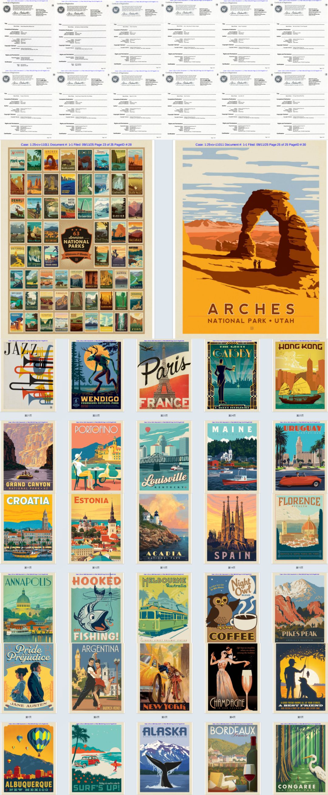 不同于普通版权诉讼,ADG的维权堪称“精准打击”,从已公开的180家被告店铺(2025-cv-11011案件)来看,80%集中在亚马逊家居类目(如复古海报挂画)和Etsy文创店(贴纸、笔记本),且都涉及ADG最核心的“美国国家公园系列”“意大利海岸风光”等设计。Allen团队提醒:参考7月25-cv-07470案件(14天内获批TRO),本次批量诉讼的冻结风险极高,曾销售复古风格装饰画、旅行主题衍生品的卖家必须立即排查。