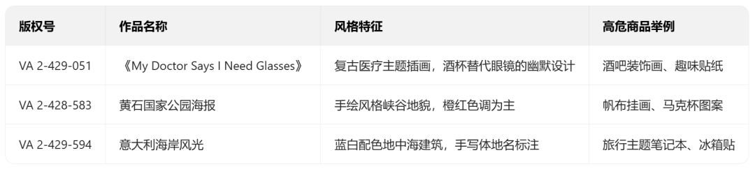 标志性视觉符号:已维权的59个版权中,"美国国家公园系列"的山脉剪影(如VA2-429-187号作品的锯齿状山脊线)、"世界旅行系列"的手写字体(字母间距2.5mm±0.3的复古衬线体)、"纳什维尔精神系列"的乐器轮廓(萨克斯与吉他的交叉构图)是高频侵权元素。某亚马逊卖家因使用相似山脉线条设计旅行杯,在7月案件中被判赔偿1.8万美元。