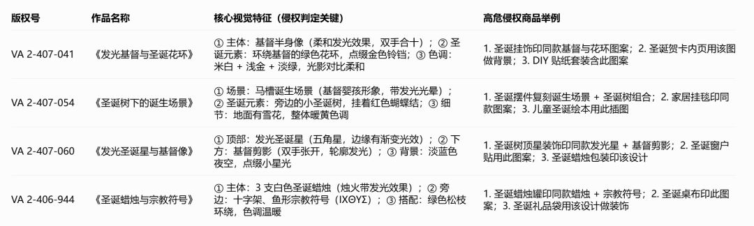 自查重点:拿自家的圣诞商品,对照上面4个版权的 “三大核心特征”(发光效果、宗教元素、圣诞场景),打开所有圣诞相关商品的标题、描述,删除 “Corbert Gauthier”“发光基督圣诞”“宗教圣诞版权图”“Christian Christmas art by Corbert” 这些词,连 “柔和光效圣诞装饰”“神圣感圣诞挂饰” 这种擦边描述也得改。