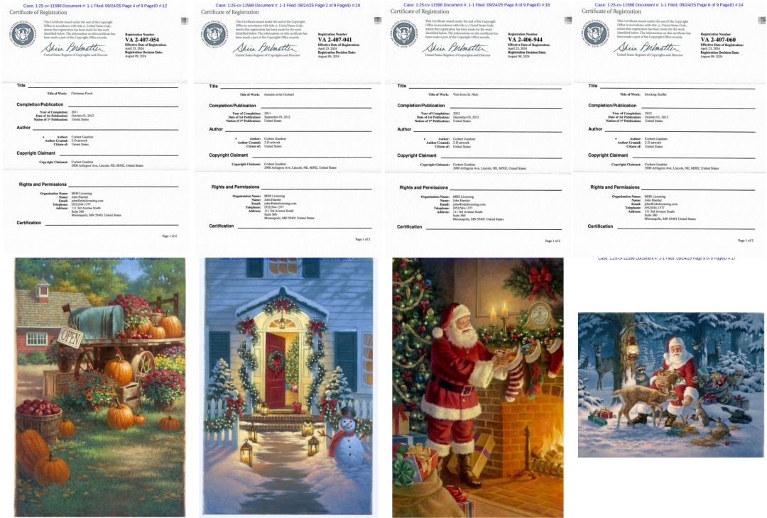 擅长宗教题材的美国艺术家Corbert Gauthier,已经通过Keith律所在圣诞旺季前发起版权维权(案件编号:2025-cv-11598)!本次维权核心瞄准4个圣诞主题版权作品(VA 2-407-041、VA 2-407-054、VA 2-407-060、VA 2-406-944),这些作品全是 “宗教元素 + 圣诞场景” 的结合款,目前案件已进入证据固化后期(Allen团队从行业渠道获悉,Keith律所已在亚马逊、Etsy抓取近40件疑似侵权商品,重点排查 “发光圣诞装饰”“宗教主题圣诞卡” 类目)。
