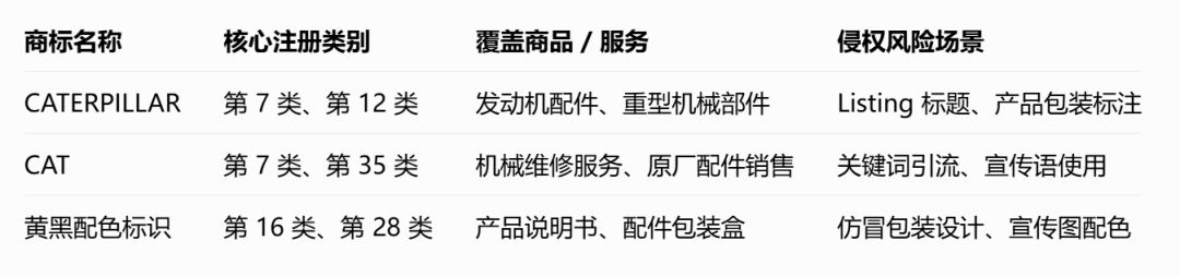 自查重点:打开USPTO官网,搜索专利号D754304获取专利附图,重点比对自家产品的 “边缘弧度”“中央纹路”“接口形状” 三大特征,只要有两处以上相似就存在风险;删除标题、卖点描述中的“CAT”“CATERPILLAR” 等直接关键词,避免使用 “卡特同款”“替代 CAT 配件” 等模糊表述;检查产品包装、宣传图是否使用黄黑配色,是否出现类似CAT的字母标识,哪怕是变形设计也可能踩线。