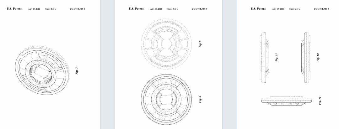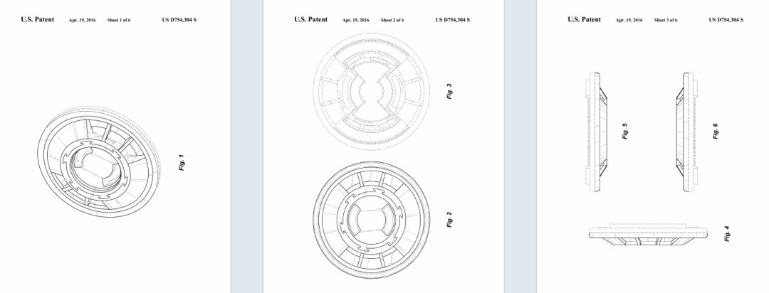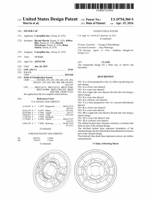 本次维权的核心是外观设计专利(专利号:D754304),该专利于2016年4月19日获美国专利局授权,保护范围聚焦发动机滤清器盖子的整体造型与结构细节, 包括圆形盖体的边缘弧度、中央凸起的纹路设计、安装接口的轮廓比例等关键视觉特征。根据美国专利法 “字面保护原则”,只要产品在外观上完整再现这些设计要点,即便材质或尺寸略有差异,仍可能被认定为侵权。Allen团队通过USPTO数据库核查发现,该专利目前处于有效状态,且卡特彼勒未放弃任何权利要求项,维权时可覆盖所有与专利附图 “实质性相似” 的仿制产品。